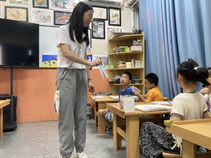 实践团队都是艺术类专业的大一员工,具备扎实的绘画功底,在来之前,早就为孩子们筹备好了整套的马克笔、崭新的水彩本等精心挑选的美术用品工具。当孩子们拿到手的那一刻,新奇、喜悦、兴奋……这一系列小表情全部写满在他们稚嫩的脸庞上。一谈到这节课的绘画主题是“为家人绘蛋糕”,就有个自来熟的孩子站起来提到自己的妈妈即将在7月份过生日,没想到瞬间打开了所有孩子们的话匣子。于是,他们一个个生龙活虎地开始群聊起谁过生日、谁喜欢吃什么样的蛋糕之类的有趣话题,乐得实践团队员们很快就和他们熟络了起来。接下来,实践团队的一名队员充当老师在黑板前用生动朴实的语言,绘声绘色地给孩子们边讲边示范起蛋糕的画法。孩子们顿时全部安静了下来,一个个目不转睛、全神贯注地听着,眼神里充满了好奇与期待。当轮到他们自己开始动手画画时,实践团队员们温柔地鼓励并指导他们在原图的基础上,创造性给蛋糕添加各种自己喜爱的图案和颜色,使得每个蛋糕都别具一格。最后在点评环节时,实践队员一一表扬了孩子们创造的各自优点,孩子们都听得格外认真。在提问到可以把这次画的蛋糕送给谁时,一个年纪最小的男孩,站起来羞涩地说,想要带回老家送给自己的奶奶,因为奶奶从来没有见过蛋糕,以后长大了要买个大大的蛋糕送给她过生日。听着孩子最真挚朴实的言语,实践队员们一下子都陷入了沉思。