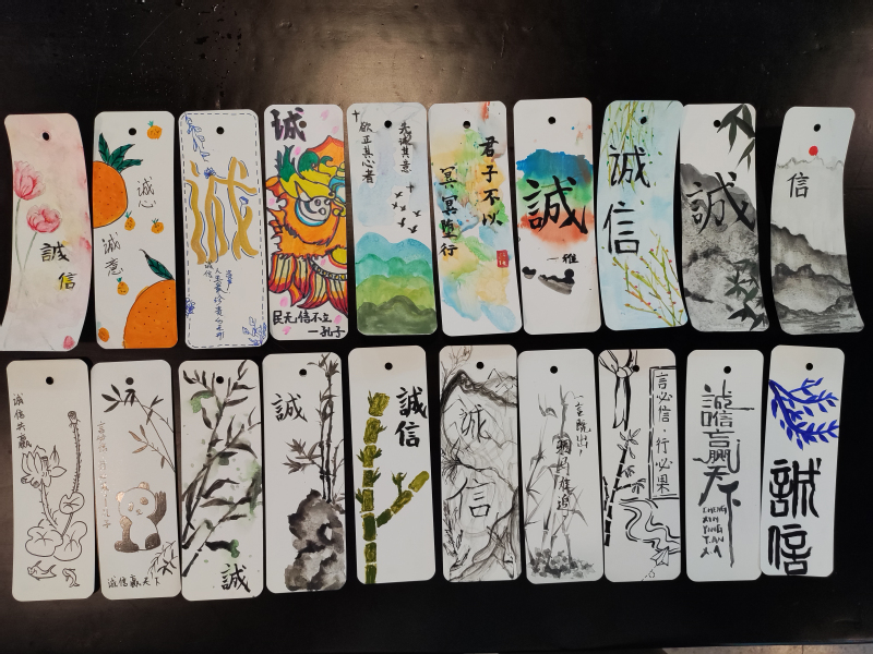 5月21日下午三点,同学们在书签上用文字和图画创造属于自己的诚信箴言,用一抹一线,述说诚信故事。一枚小小的诚信书签,承载着同学们对知识的渴望,对诚信的坚守;一枚精致的诚信书签,不仅能够提升同学们的阅读兴趣,还能时刻提醒同学们诚于心、信于行。手绘书签事情虽小,却处处闪耀着诚信的光芒,点滴细节中,无不彰显着诚信浸润人心的强大精神力量。