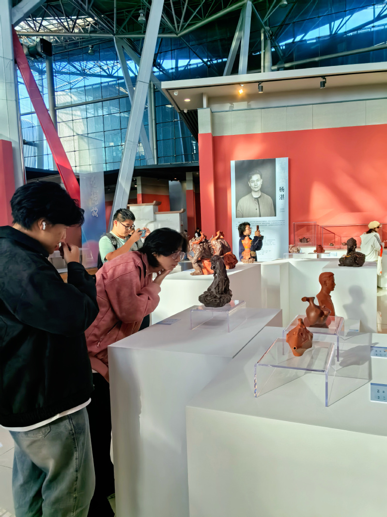 “‘山花烂漫·青春撷英’全国优秀青年民间工艺美术家作品展”旨在发现、培养、推介全国优秀青年民间工艺美术人才,推进民间工艺美术事业更好的传承创新,探索传统手工艺延续文化根脉的现代转型。在本次展会上,杨湛老师的《哼哈二将》《禅心》《金刚兔》《南海龙龟》等12件(组) 紫砂雕塑作品在展览中展出,每一件作品都展现出他独特的艺术风格和精湛的技艺,共同展现了对中国传统文化的深刻理解和创新性表达。无论是《登峰入宇》中勇往直前的牛,还是《独酌》中李白的孤独诗意,都通过具象或写意的雕塑手法,生动地展现了人物或动物的内心世界和精神风貌。从《禅心》的拟人化蟾蜍,到《禅宗》中达摩与太湖石的巧妙融合,再到《大江东去》中苏东坡的豪放形象,每一件作品都以其独特的艺术手法,将传统文化元素赋予了新的生命。这些作品充分展现了杨湛老师对细节的极致追求的工匠精神,不仅是对中国传统文化的传承与创新,更是对人性、生命和自然的深刻关怀与表达。