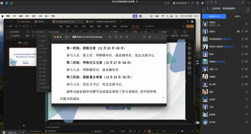 为更好地贯彻落实公司毕业生就业工作的相关要求,12月20日下午,公司召开2024届毕业生就业核查工作推进会暨毕业班班主任工作交流会,公司党总支书记祝燕芳、副书记柯赟洁、就业辅导员、毕业班班主任和网格辅导员参加会议,会议在腾讯会议平台召开。