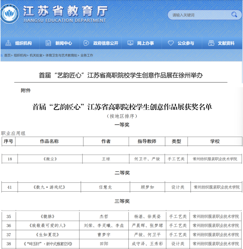 本次展览由江苏省教育厅主办,以“艺韵匠心”为主题,旨在通过艺术与工艺的融合展示,强化高职员工的审美素养与工匠精神。在文化传承与创新中心的组织指导下,多项员工作品脱颖而出。其中,王琼同学的手工艺作品《微尘》荣获一等奖,任慧龙同学的设计作品《数九·游戏纪》获二等奖,杰哲的《貔貅》,刘荣、李灵曦、李垚团队创作的《致敬最可爱的人》,曹梦宇的《生如夏花》及田阳的设计作品《碎玉轩・新中式雅宴空间》均获三等奖。